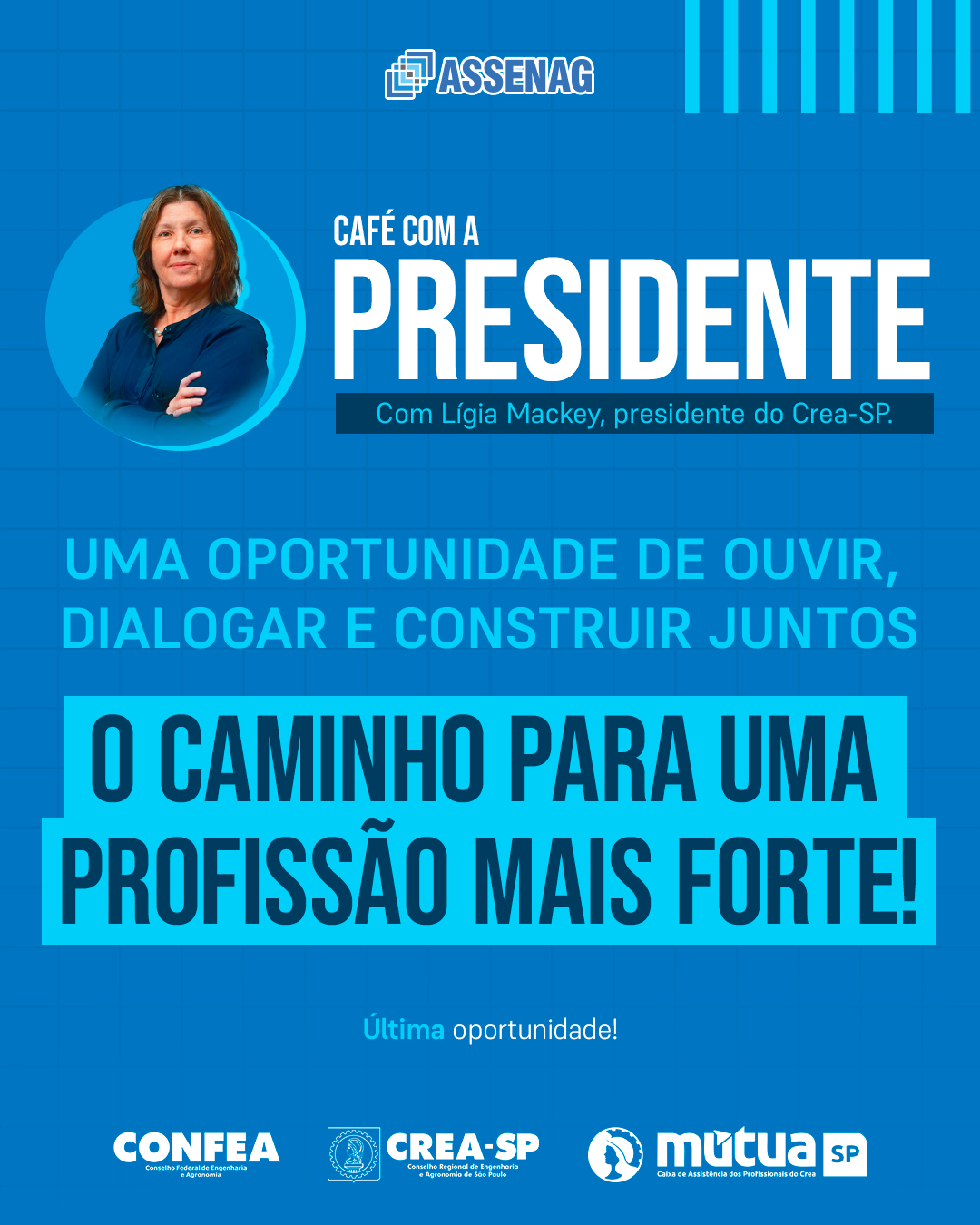 ⚠️ Últimas vagas para “Café com a Presidente”, um encontro especial com Lígia Mackey, engenheira civil e presidente do Crea-SP, que acontece.