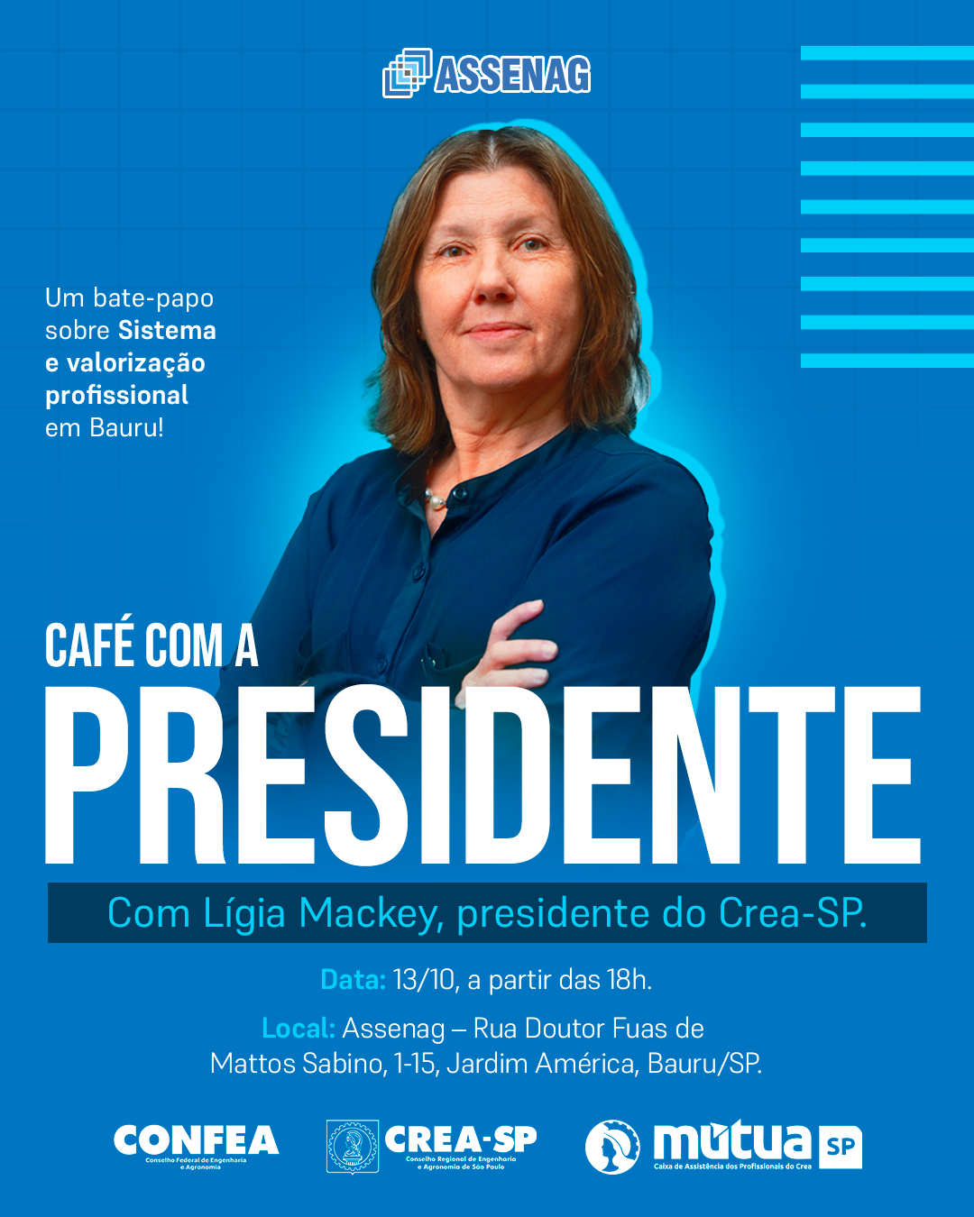 ⚠️ Últimas vagas para “Café com a Presidente”, um encontro especial com Lígia Mackey, engenheira civil e presidente do Crea-SP, que acontece na próxima segunda-feira, dia 13/10,.